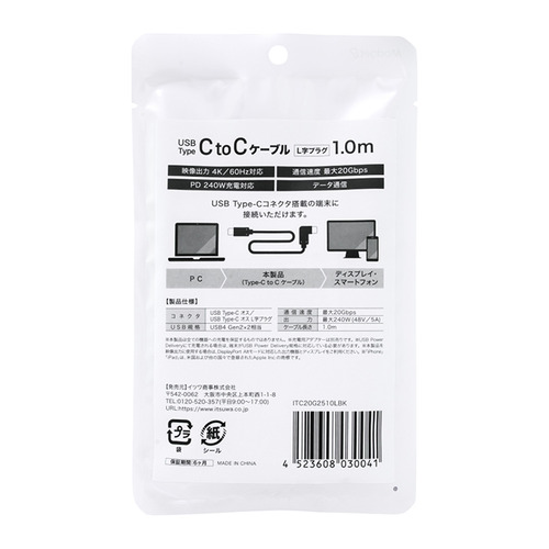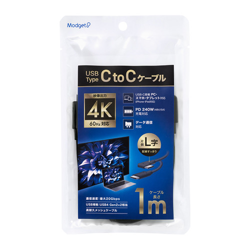 Modget ITC20G2510LBK USB4.0 TYPE-C TO C L字 ケーブル 20Gbps PD240W 1.0m ブラック