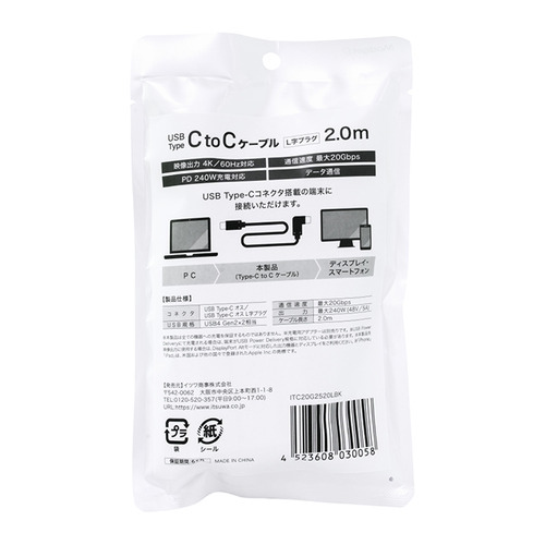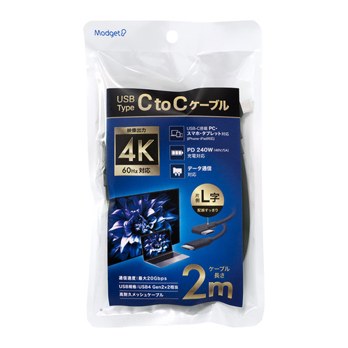 Modget ITC20G2520LBK USB4.0 TYPE-C TO C L字 ケーブル 20Gbps PD240W 2.0m ブラック