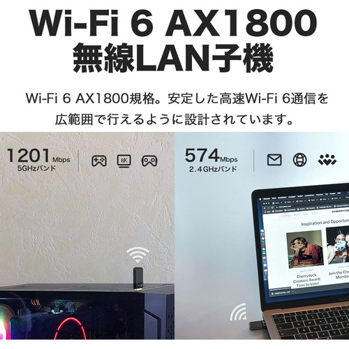 信号レート:5GHz:11ax:最大1201Mbps(動的)11ac:最大867Mbps(動的)11n:最大300Mbps(動的)11a:最大54Mbps(動的)2.4GHz:11ax:最大574Mbps(動的)11n:最大400Mbps(動的)11g:最大54Mbps(動的)11b:最大11Mbps(動的)