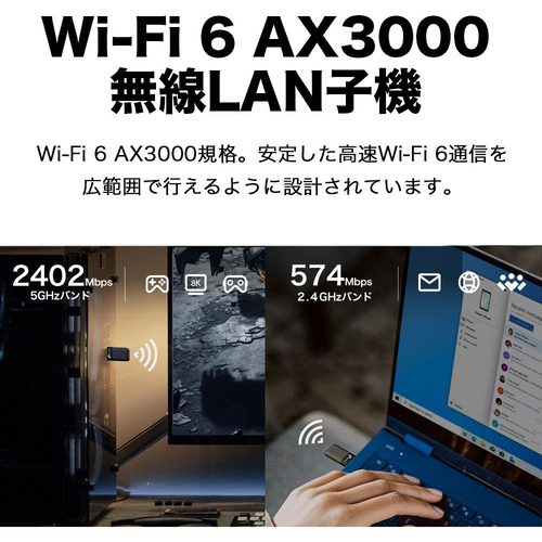 デュアルバンドに対応し、最大3000Mbps(5GHz:2402Mbps + 2.4GHz:574Mbps)の通信速度を実現します。
