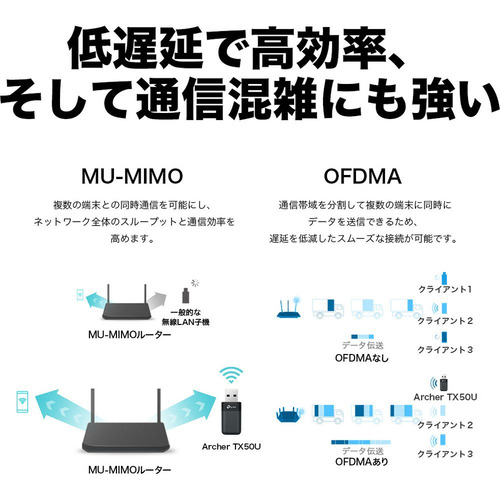 MU-MIMO・OFDMAテクノロジーが通信を効率化し、より快適な通信を実現します。