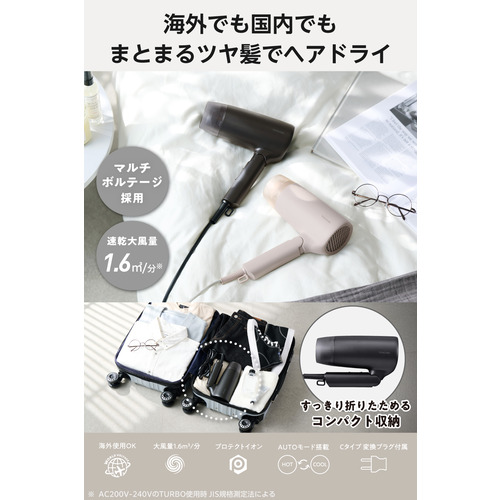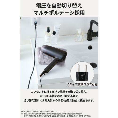 ●海外でも、ツヤのある美髪を保つ。プロテクトイオンを搭載し、髪の広がりを抑制して美しさを守るヘアドライヤーです。ワールドボルテージ対応で日本国内はもちろん、海外でも使えます。面倒な電圧切り替えが不要なマルチボルテージ(自動電圧切り替え式)と、幅広い国で使えるCタイプ変換プラグ付きなので、海外旅行に便利です。
