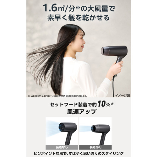 ●大風量の1.6m3/分(※)で、髪をすばやく乾かせます。海外でもたっぷりの風量で時短のヘアドライができます。 ※AC200V-240VのTURBO使用時 JIS規格測定法による