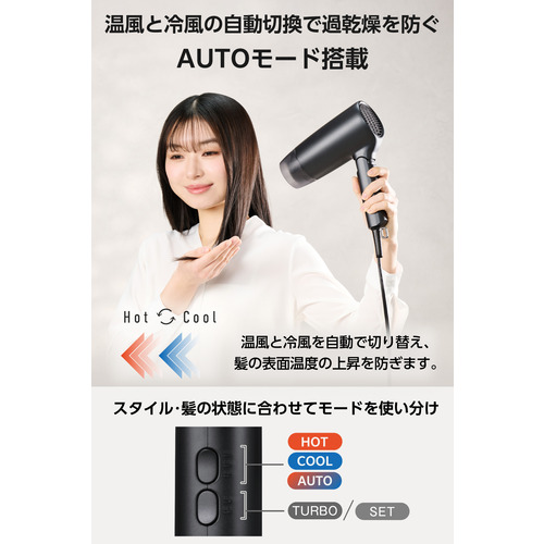 ●HOT/COOL/AUTOの3つのモードを搭載し、お好みの温度を選べます。温風と冷風が交互に自動で切り替わるAUTOモードで熱ダメージを抑制し、髪を優しく乾かします。