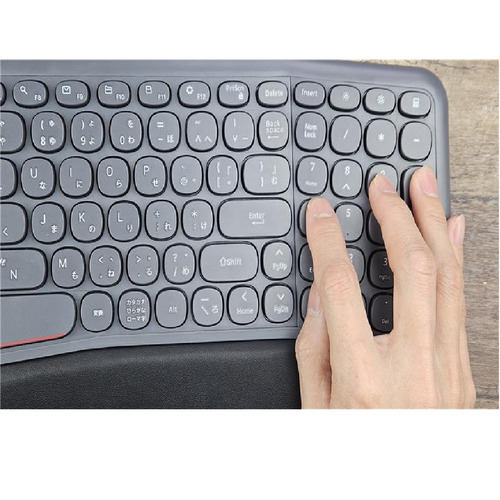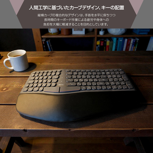 縦横カーブの複合的なデザインは、手首を水平に保ちつつ、手のひらを自然に内側へ傾斜させることで、長時間のキーボード作業による疲労や身体への負担を大幅に軽減することを目的としています。