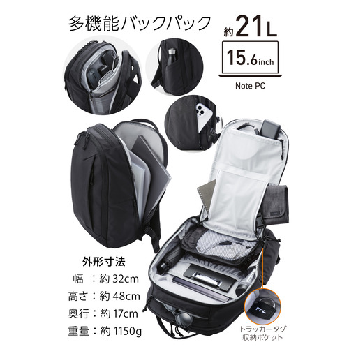 ポケット(気室内):メイン気室:タブレット用オープンポケット(起毛)×1、オープンポケット×3、ファスナーポケット(ストレッチメッシュ)×2、AirTag用オープンポケット×1
