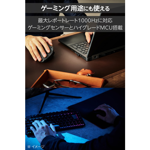 ●ELECOM Bridge G1000ワイヤレステクノロジーにより、ゲーミングセンサーとハイグレードMCUを搭載。最大レポートレート1000Hzに対応し、ゲーミング用途にも耐えうる通信とトラッキング性能を持っています。