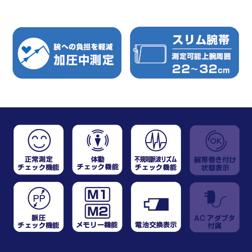 正しい血圧測定をガイドし測定時の不安を解消します。血圧測定において重要な腕帯の巻き具合や測定時の安静状態などをチェックし、正常に測定できたことをお知らせします。