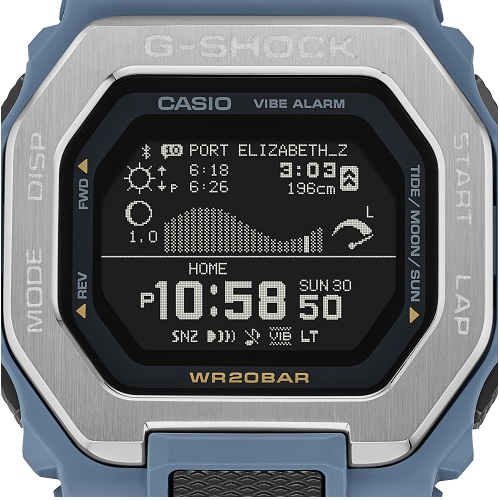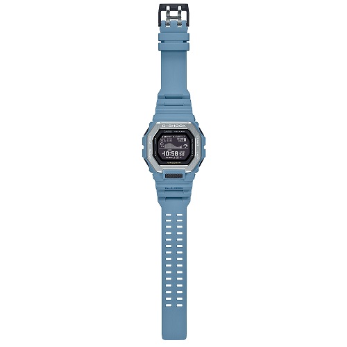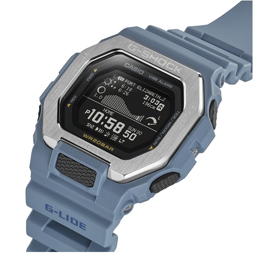 ●世界のトップサーファーから支持を受けるG-SHOCKのスポーツラインG-LIDE。スマートフォンリンクを搭載したGBX-100のビーチの自然な姿をイメージしたNewカラーです。このモデルはサーファーが必要とする潮汐情報や日の出/日の入時間を、専用アプリケーションに内蔵されている世界約3300ポイントから選択し簡単に時計側に設定することができます。また、ワイドフェイスで高精細なMIP(メモリインピクセル)液晶を採用することで視認性を高め、タイドグラフ、ムーンデータ表示に加え、満潮/干潮時間、満潮/干潮の潮位、日の出/日の入時間が表示可能です。これにより一目で現在の状況を詳細に把握できるようになりました。トレーニング計測機能(距離、速度、ペース、ラップ、ピッチ計測)と合わせて、世界を飛び回りタフに戦い抜くサーファーを手元からサポートします。ベゼルは樹脂とメタルを組み合わせて構成。ベゼルのトップ部分はステンレスパーツを用い、ヘアラインとホーニング加工を施した仕上げ分けで強度と質感を両立したデザインになっています。また姿勢が安定しない環境を想定し、上下左右からの衝撃に耐えられる樹脂のガード構造を用い、6時位置のボタンガードと共にG-SHOCKならではの耐衝撃性能を備えました。バンドには、6時位置の根元部分にフィット性と水、汗逃げを考慮したスリットが入ったバイオマスプラスチックのソフトウレタンを採用し、着け心地を追求しました。遠くまで広がる自然な海をイメージしたブルー、砂浜をイメージしたベージュの2色展開でナチュラルな仕上がりのG-LIDEです。 【仕様】