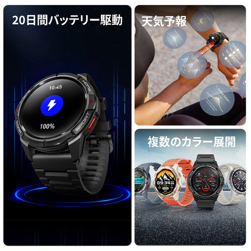 主な機能:心拍数モニタリング、ストレスモニタリング、睡眠モニタリング、歩数、カロリー消費、血中酸素レベル測定、様々なスポーツモード、着信、アプリ通知、天気予報、気圧高度計、スマートフォンを探す