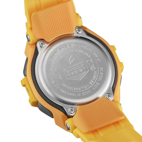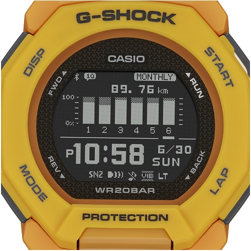 ●G-SHOCKのスポーツラインG-SQUADより、アクティブなユーザーをサポートするGBD-300シリーズの紹介です。GBD-300は、加速度計、距離測定機能、スマートフォン連携や高精細ディスプレイなど、ランニングをはじめとしたトレーニングに役立つ機能を備えています。スマートフォンのGPS機能と連携することで計測距離を補正。補正後は、時計単体でより正確な走行距離の計測が可能となります。走行ペースの計測や自動でタイムを計測するオートラップ機能も搭載。さらに、専用アプリのG-SHOCK MOVEでライフログやアクティビティ履歴が可視化されるので、自身の運動記録を直感的に確認することができます。ディスプレイには高精細MIP液晶や、スーパーイルミネーターを採用。ランニング中に腕を傾けることで点灯する、オートライト機能と合わせて夜間での視認性にも配慮しました。ケース側面の逆スラント形状により、薄さを感じさせるすっきりとしたデザインとなっています。バンドにはソフトウレタン素材を使用しフィット感を高めるとともに、5mmピッチのバンド?により細やかな?さ調整が可能です。ソフトウレタンと可動式のバックプロテクターにより、さまざまなサイズの??に柔軟に対応し、腕の動きに合わせてフィット感を?めています。ケース、バンドなどの主な樹脂パーツには環境配慮型の「バイオマスプラスチック」を使用。くわえて、バイブレーションアラーム機能も備えており、トレーニング中の経過時間や消費カロリーのアラート取得だけでなく、スマートフォンからの電話、メール、ソーシャルメディアの通知も受信することができます。日常の健康管理から、ランニングの持久力強化まで、幅広く役立つG-SQUADに仕上げました。・スマートフォンのGPS機能と連携した距離計測補正機能・タイム計測に加え、距離・速度・ペース・消費カロリーの計測が可能なランニング計測機能・歩行開始とともに自動で歩数を計測するステップトラッカー・インターバルトレーニングに役立つマルチタイマー・ラップメモリー最大140本×100走分対応のトレーニング計測機能・専用スマートフォンアプリによる、トレーニング管理機能(達成度、履歴、プラン)・高輝度なオートLEDバックライト(スーパーイルミネーター)・装着性に優れたソフトウレタンバンド・歩数計測、通知 【仕様】