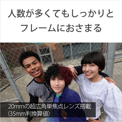 ・超広角単焦点レンズのツァイス テッサー T*レンズを搭載。超広角20mm(*)の画角と開放F値2.0の明るさで、写真はもちろん、Vlog・動画撮影にもおすすめです。人間の目よりも広い画角なので一味違う表現も楽しめます。・(*)35mm判換算値