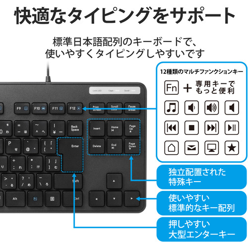 サクサク軽い打ち心地で、PCに挿すだけで使える有線薄型テンキーレスキーボード。