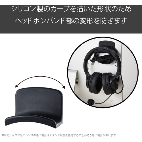 ●ディスプレイの背面などに貼り付け、デッドスペースを有効活用して収納でき、シリコン製のカーブを描いた形状でヘッドホンバンド部の変形を防ぐヘッドホン用ハンガー型スタンドです。