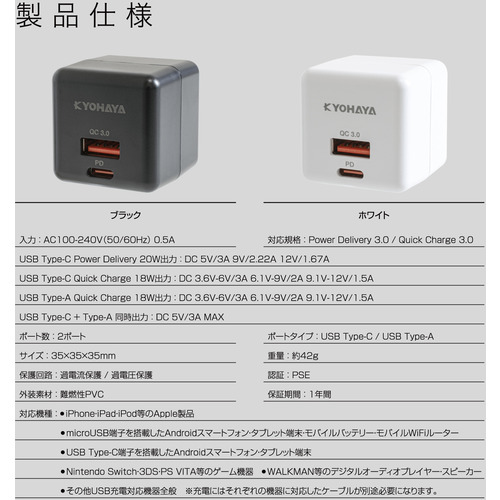 京ハヤ JKPD20S2BK AC充電器PD20W2ポート KYOHAYA BK
