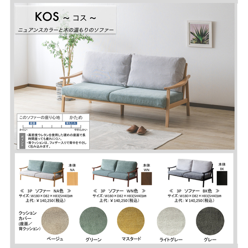 [幅180]3PソファKOSコス本体NA色座マスタード/背マスタード