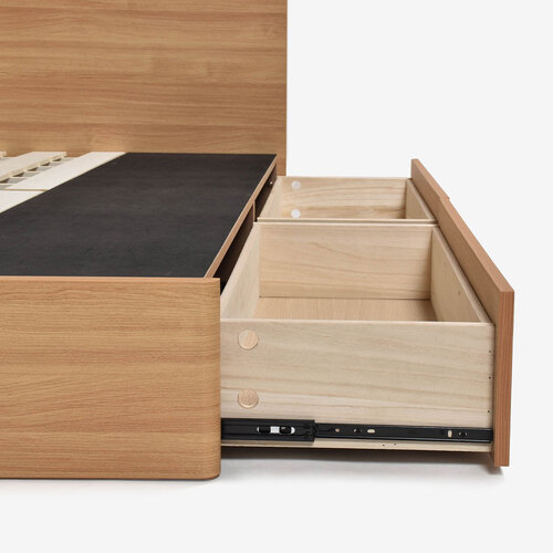 引出し内部は桐材を使用しています。ベッドフレーム内にこもりがちな湿気から大切な衣類を守ってくれます。引出しは左右どちらにも取り付けが可能です。