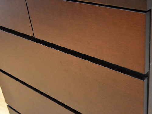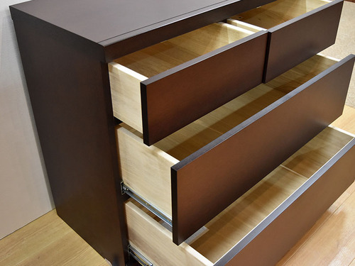 高脚ですので、家具の下まで掃除することができます。大きさの違う3種類の引出しですので、収納物の仕分けに便利です。また、最下段の引出しはフルオープンレール付きでかさ張る衣類の収納に便利です。