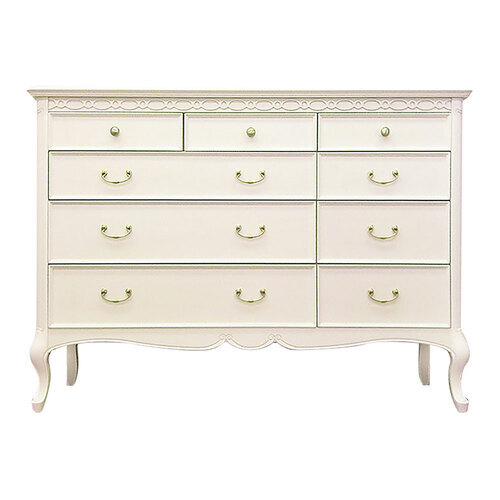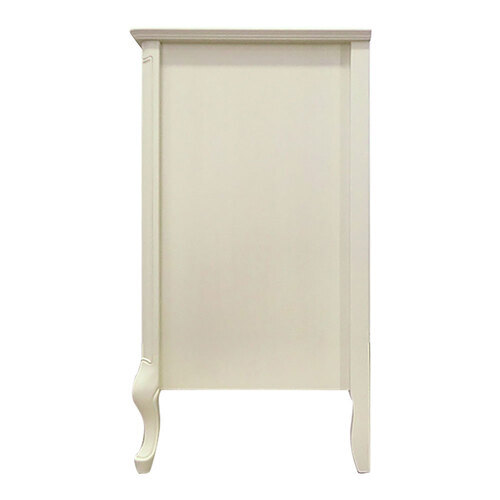 フレンチカントリースタイルの家具のデザインは丸みを帯びた優美なラインのものが主流で、 フレンチエレガンスの代名詞ともいえる「カブリオールレッグ」(猫脚)となめらかな女性的な 美しいラインが特徴です。フルールWHシリーズは表面になめらかな木肌のリンデン材、脚部にマホガニー材を使い、 木肌が薄っすら残るミルキーホワイトカラーで上品な印象に仕上げたシリーズで、フェミニンスタイル、ガーリー・ロマンティック等の エレガンススタイルやロココ調コーディネートで、優しい気分になれるような インテリア空間を作り出してくれます。