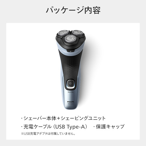 同梱物:・シェーバー本体+シェ ービングユニット ・取扱説明書 ・充電ケーブル ・保護キャップ ※USB 充電アダプタは付 属していません