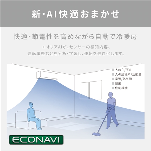 センサー・AI:ひと・もの・温冷感(不在節電・オートオフ)、日射センサー、おへや学習機能