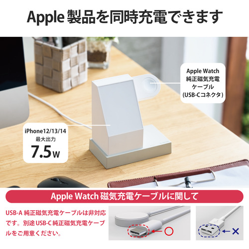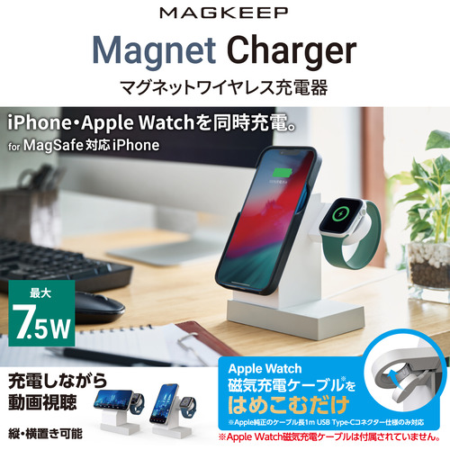 ●MagSafe対応iPhoneシリーズをマグネットで固定し7.5Wで高速充電でき、さらにApple Watch磁気充電ケーブルをはめ込むことでApple Watchを同時に充電できるワイヤレス充電器です。