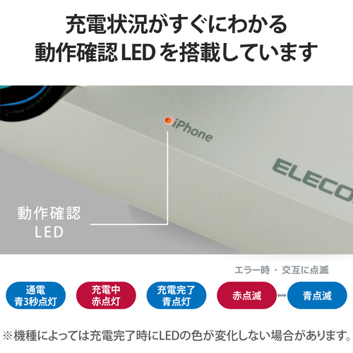 LED発光色:通電:青3秒点灯/待機:消灯/充電中:赤点灯/充電完了:青点灯/エラー時:赤青点滅 ※機種によっては充電完了時にLEDの色が変化しない場合があります。