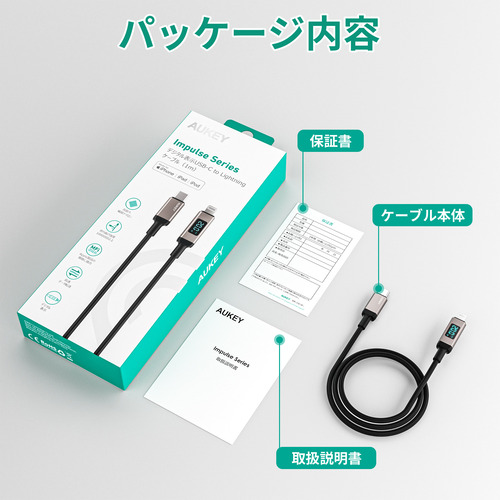 AUKEY Impulse Series デジタル表示 USB-C to Lightningケーブル(1m)はLightning端子搭載のさまざまな機器の充電に最適です。