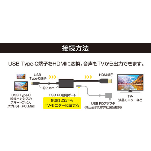 対応機種:・映像出力に対応したUSB Type-C端子搭載のノートPC、MacBookシリーズ、タブレット、スマートフォン、iPadシリーズ ※USB Type-C端子からの映像出力機能(ALTモード)に対応している必要があります。・HDMI搭載の液晶モニター、液晶テレビ