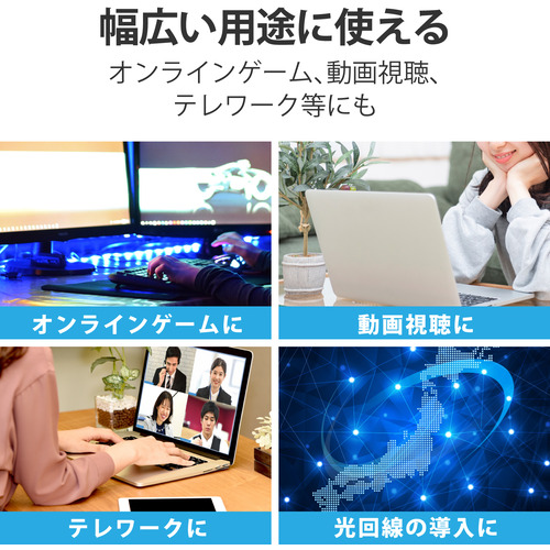 ●カテゴリー6の2倍である500MHzまでの高周波領域まで対応しており、ノイズ干渉にも強く、高速で安定したネットワーク環境を実現します。