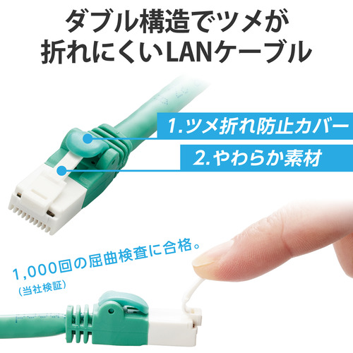 ●ツメ折れ防止プロテクターと屈曲に対する耐久性が高い新素材コネクターを採用したダブル構造で、ツメが折れにくいLANケーブルです。 ※1000回の屈曲検査に合格(当社検証)