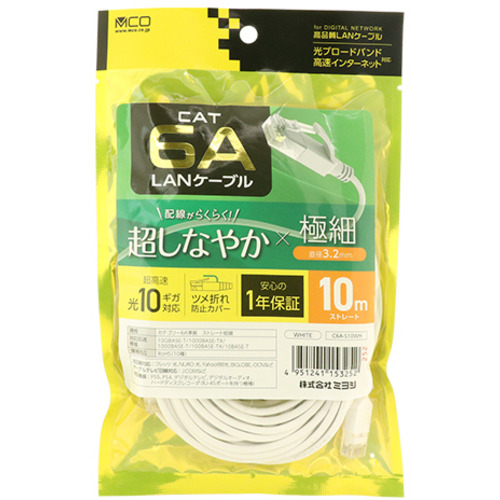 ミヨシ C6A-S10WH 極細LANケーブル 10m 白 C6AS10WH