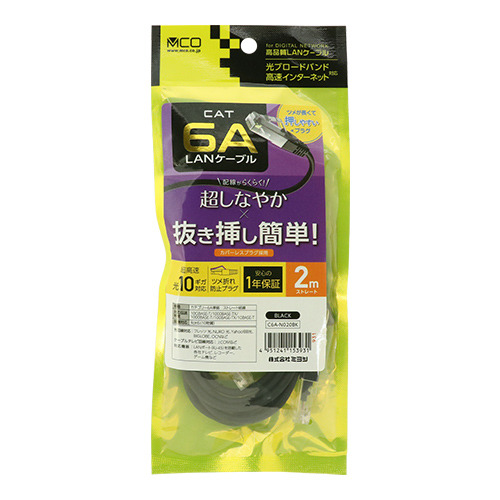 ミヨシ C6A-N020BK カテゴリー6A 抜きやすい LANケーブル 2m 黒 C6AN020BK