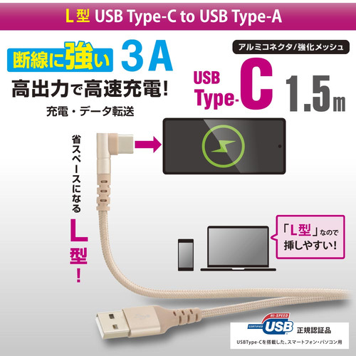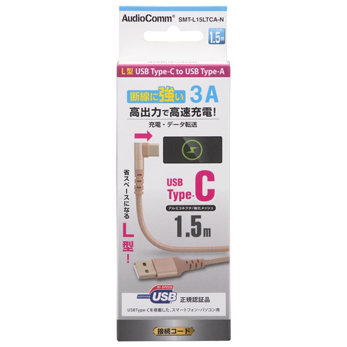 オーム電機 SMT-L15LTCA-N 断線に強いTypeCケーブル L型 1.5m