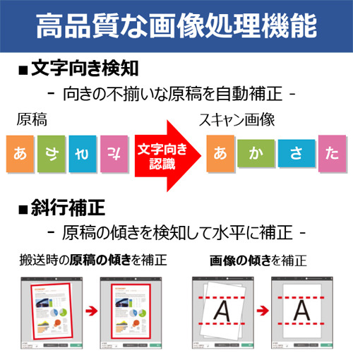 原稿の傾きを自動的に水平に補正し、見やすく活用しやすい画像データを生成します。さらに画像の直線や文字列など原稿内容の傾きを補正する機能も搭載。2タイプのモード設定が行えます。