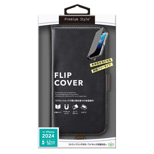 PGA PG-24CFP02BK iPhone16 Plus用 フリップカバー Premium Style ブラック