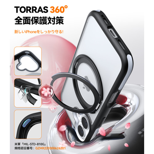 米軍規格「MIL-STD-810G」の3倍の落下試験をクリアし、3.66mから落下に耐えます。衝撃を吸収するTPU/TPE素材を使用し、エアバッグ機能が端末の4隅をガードします。カメラレンズ周りのエッジがカメラを保護します。
