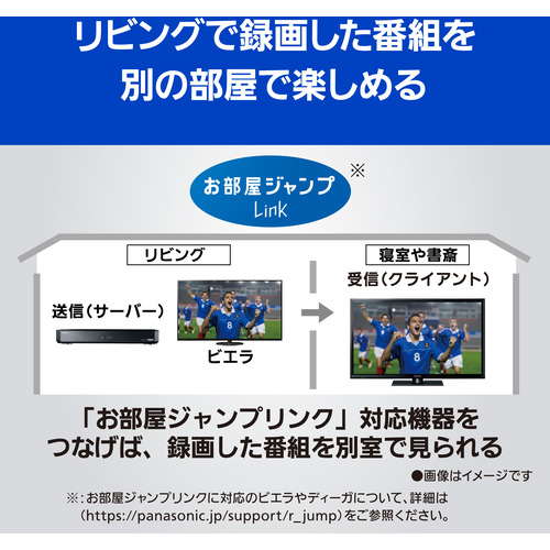 ご家庭のLAN環境と「お部屋ジャンプリンク」対応機器があれば、別室にある対応のビエラやディーガから、放送中の番組や録画番組を本機に転送が可能。別室にある本機で楽しめます。