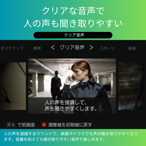 左右に加え、高さ方向の音表現も可能にする立体音響技術「Dolby AtmosR(ドルビーアトモス)」に対応。従来、立体音響を楽しむには天井を含むさまざまな場所にスピーカーを設置する必要がありました。レグザでは、最新の音声処理システムにより、テレビ本体のスピーカーでかんたんに3次元の立体音響を体感でき、映画館のような立体的で迫力のあるサウンドを楽しめます。