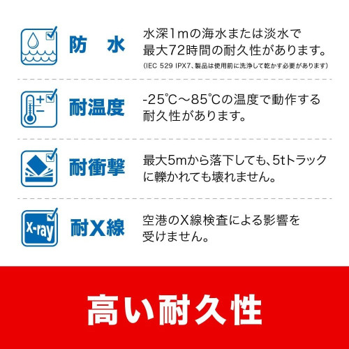 衝撃耐性、温度耐性、防水、X線耐性に優れているのでメモリーカードの耐久性を気にせずにアドベンチャーを楽しめます。