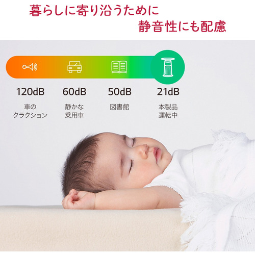 スリープモードの場合、木の葉がふれあう程度の音と言われる21dBで運転し、いつでもどこにおいても暮らしの邪魔をしません。
