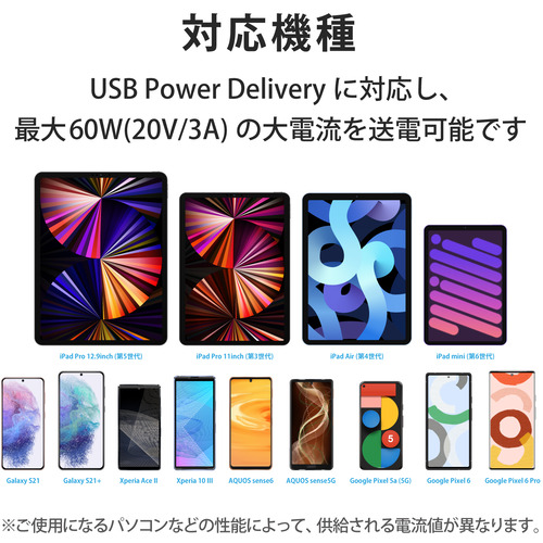 ●USB Power Deliveryに対応し、最大60W(20V/3A)の大電流を送電可能です。