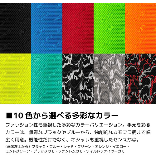 カラー展開:ブラック・ブルー・レッド・グリーン・オレンジ・イエロー・ミントグリーン・ブラックカモ・ファントムカモ・ワイルドファイヤーカモ