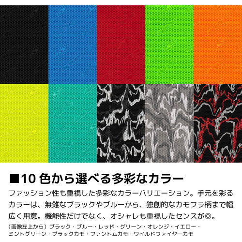 カラー展開:ブラック・ブルー・レッド・グリーン・オレンジ・イエロー・ミントグリーン・ブラックカモ・ファントムカモ・ワイルドファイヤーカモ