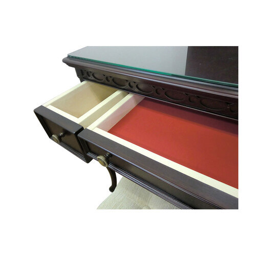 マホガニー材のソフトな木肌を活かし、フレンチクラシック調のエレガンスなデザインと、落ち着いたダークカラーに仕上げたドレッサーです。曲線ラインが魅力的な猫脚タイプのデザインで、引出し前板は矢羽根模様貼りを施すことで、高級感を表現しています。中央下段の薄い引き出しは、内部にフェルトを貼ってあるのでアクセサリー収納として利用できます。鏡は便利な三面鏡仕様で、1200Wの1口コンセントも付属しています。スツールはモケット調の張地で、ボタン締めをしたデザインになっています。 【仕様】