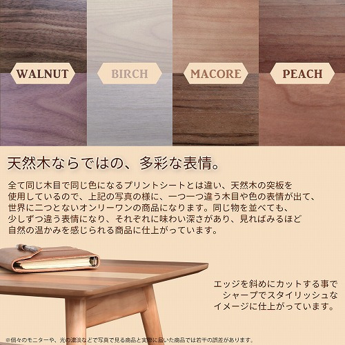 素材:【天板】中質繊維板にマコレ・ウォールナット・ピーチ・バーチの突板貼り(ラッカー塗装) 【棚板/脚】パインの天然木(ラッカー塗装)