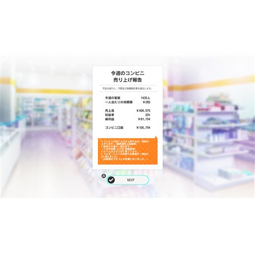 1週間単位で進行するコンビニ営業で稼いだ売り上げから、販売台を追加設置して新しい商品を入荷したり、内装デザインを変更したり、宣伝広告活動をしたりして、コンビニエンスストアの発展を目指しましょう。