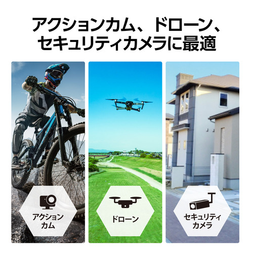 ●アクションカム、ドローン、セキュリティカメラでの使用に適しています。