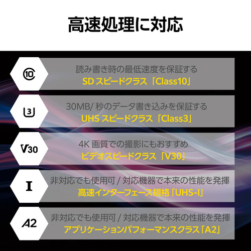 ●読み書き時の最低速度を保証するSDスピードクラスの「Class10」/UHSスピードクラスの「Class3」/ビデオスピードクラス「V30」に対応したSDカードです。