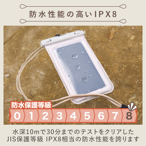 ●JIS保護等級IPX8相当の防水性能を実現する、水深約10mで30分までの防水テストをクリアしたフロート機能付きスマートフォン用防水ケースです。屋外で水や汚れを気にせず使用でき、装着したまま写真や動画撮影も可能!水没防止設計で海やプールでの使用も安心です。